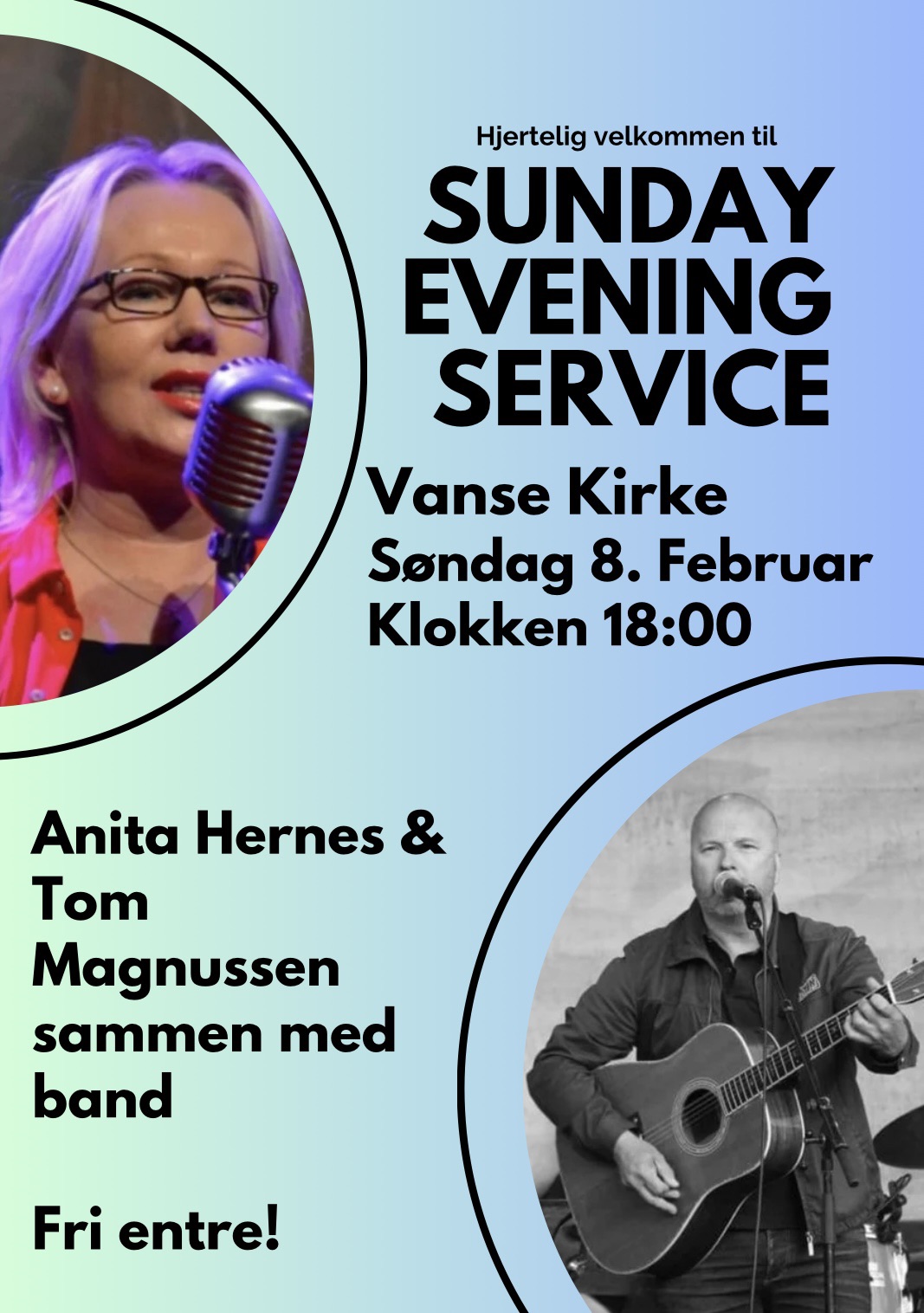 Vi har gleden av å ønske dere hjertelig velkommen til årets første Sunday Evening service 8. februar klokken 18:00 i Vanse kirke.