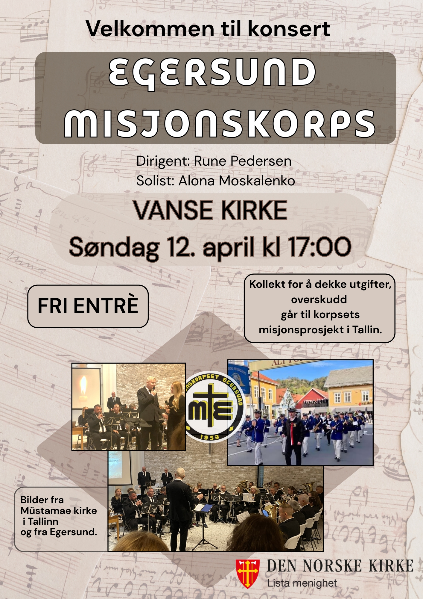 Velkommen til flott konsert i Vanse kirke i morgen - søndag 12.4. kl. 17:00.